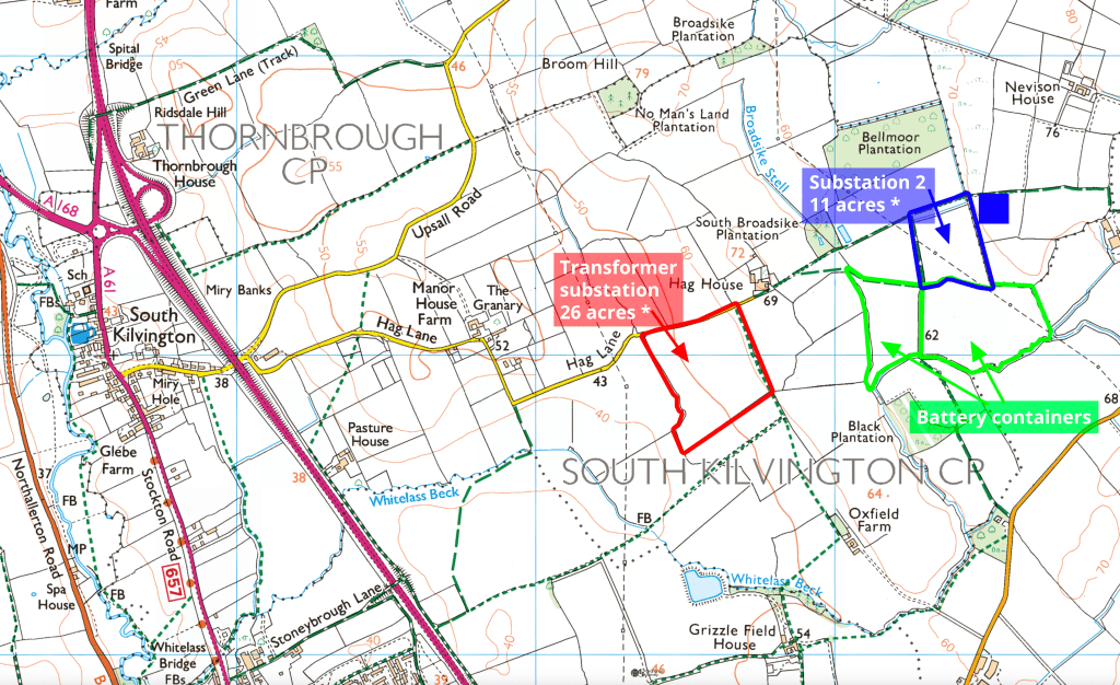 Below: An Ordnance Survey map annotated to show the sites of the transmission and transformer substations, and the battery containers.